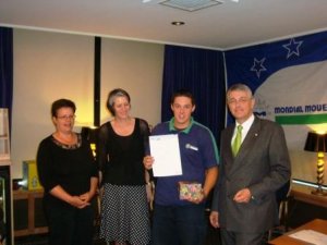 Bijgaand een foto van de uitreiking VLNR: Annemarie Hoenderdos (acteur), Margreet Zetsma (docent ROC Horizon College), Mike de Haan en Tom Stuij (directeur Mondial Movers)